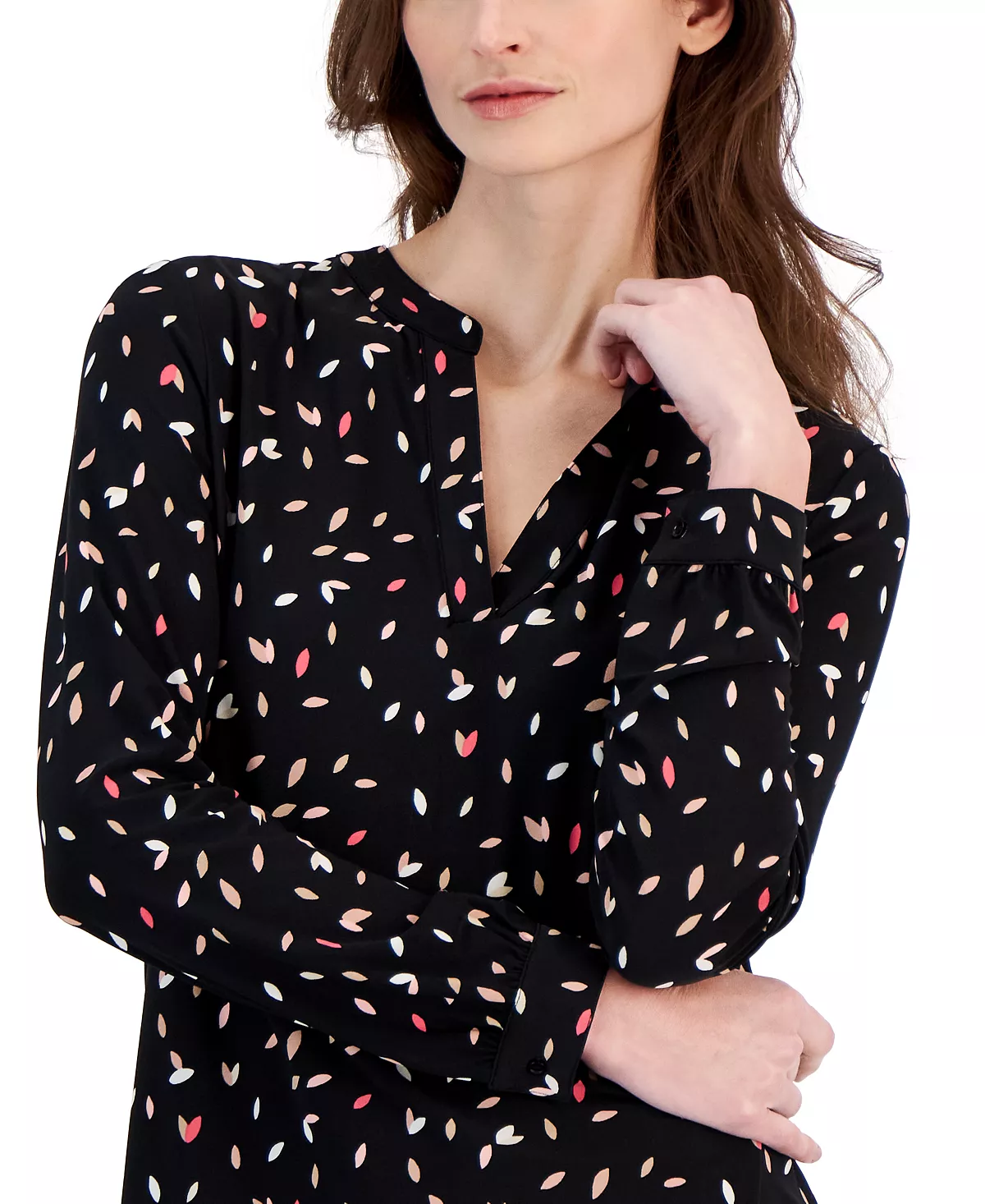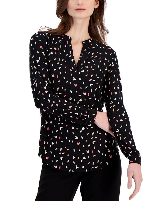 A classic top in a playful print, Anne Klein’s long-sleeve design is finished with a split neckline for a contemporary touch.
