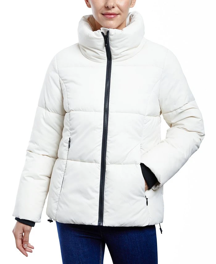 An oversized stand collar brings incredibly cozy style to this water-resistant puffer coat from Anne Klein.