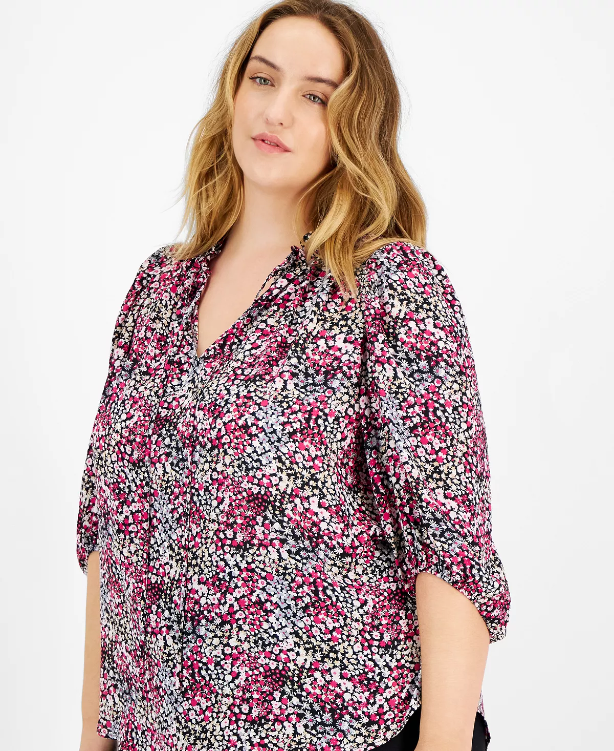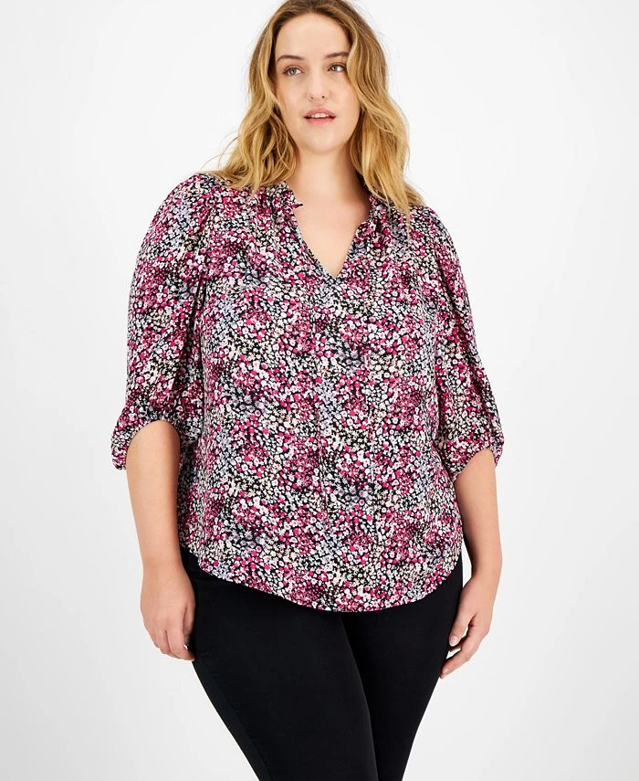 Designed in an all-over ditsy floral print and a split neckline, this Bar III top offers coverage at no cost to style.