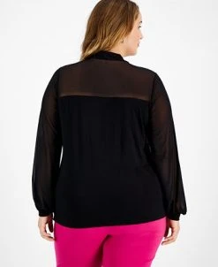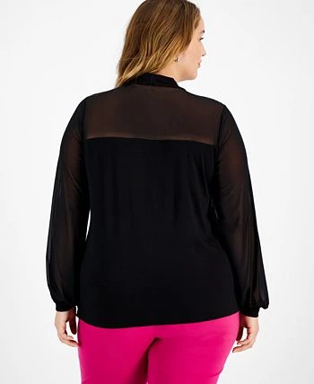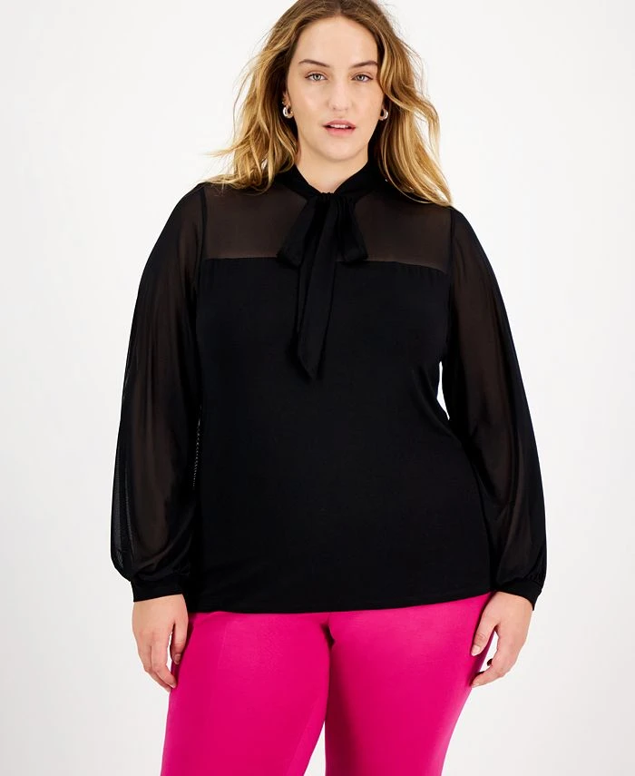 A delicate tie at the neckline adds feminine flair to this work-ready plus size blouse from Bar III.