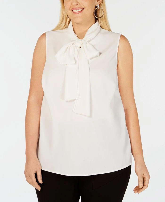 A classic tie details adds polished coverage to the neckline of this plus size sleeveless blouse from Bar III.