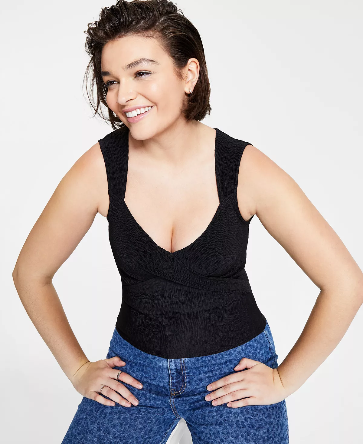 A bustier-style bodice with a crossover design brings chic style to this Bar III tank top.