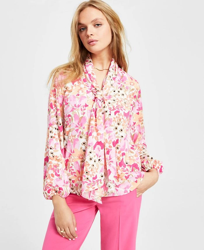 Amp up your femme factor with this tie-neck blouse from Bar III, blooming a floral print.