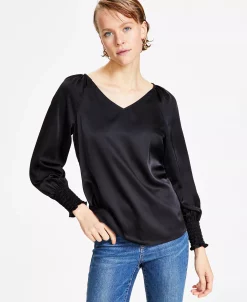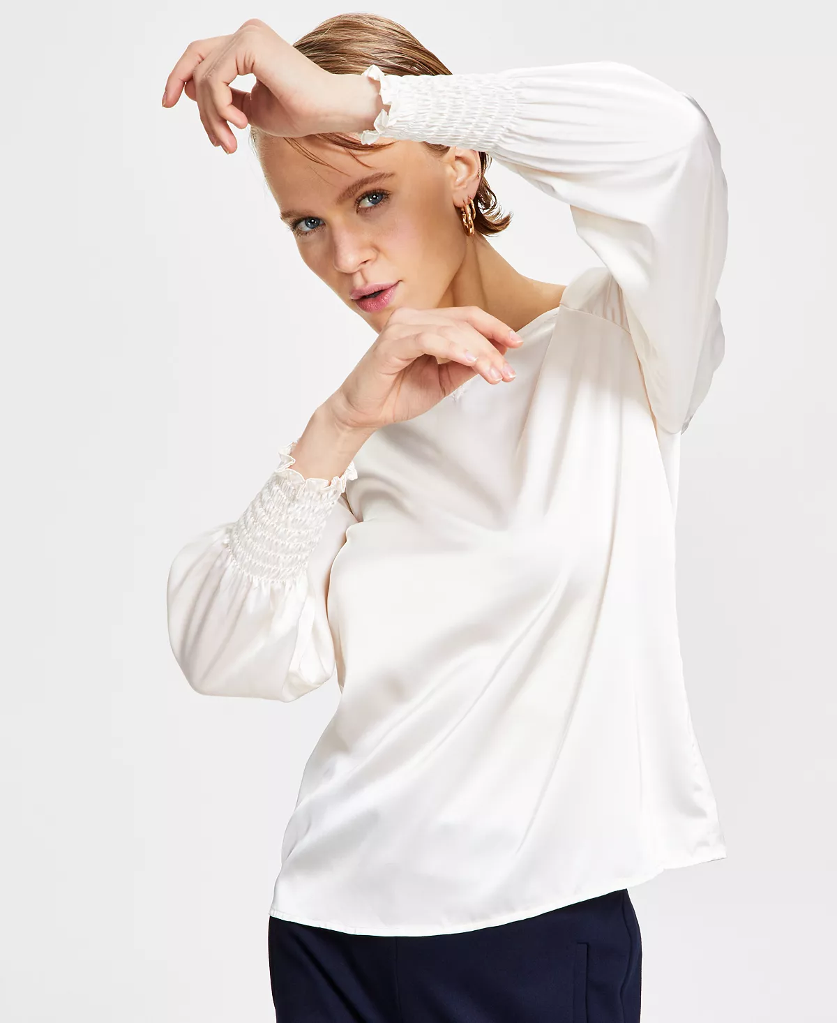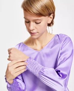 Add a hint of elegant texture to your office looks with this shiny smocked blouse by Bar III.