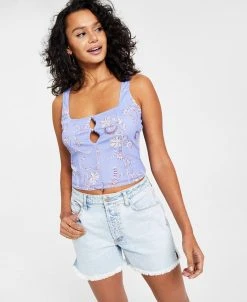 Cutouts lend a flirty look to this women’s mesh top from Bar III, featured in delicate floral prints.