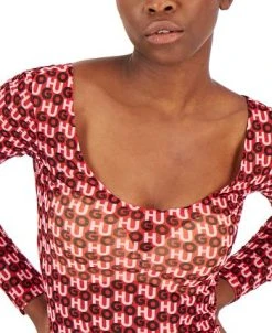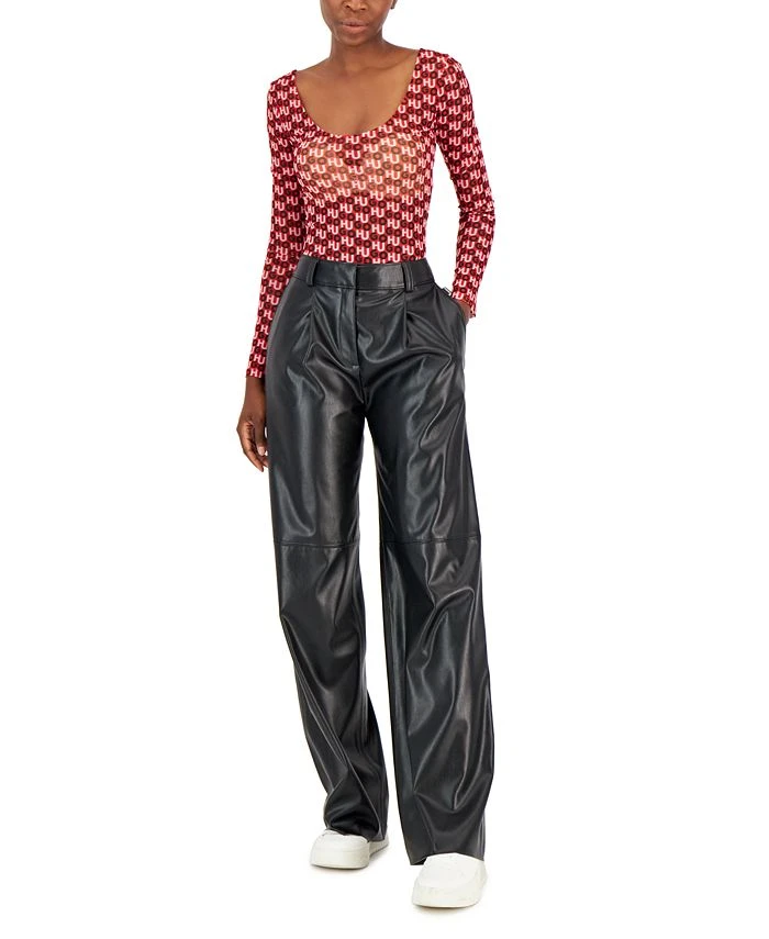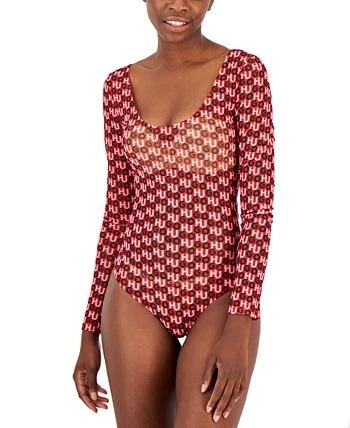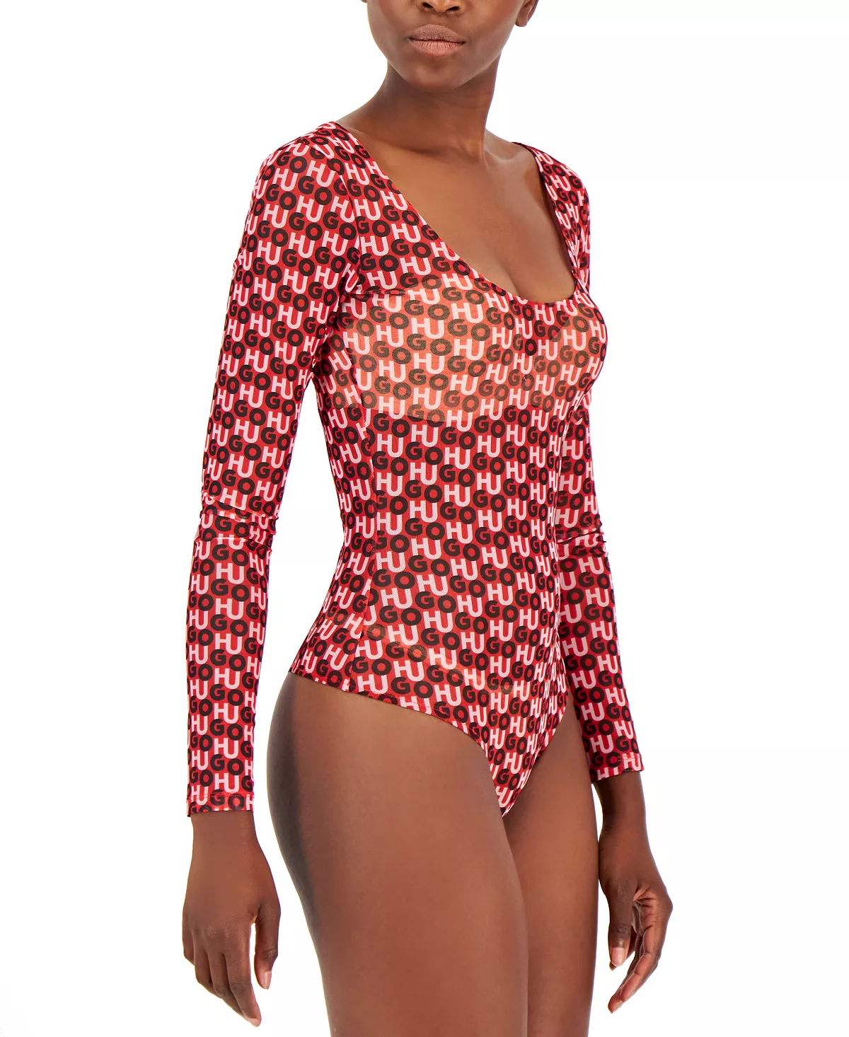 Sleek slim-fitted style is the name of the game in this signature-print mesh scoop-neck bodysuit from BOSS.