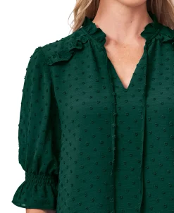 Subtle ruffles and a clip-dot design bring beautiful texture to a sophisticated silhouette with this tie-neck top from CeCe.