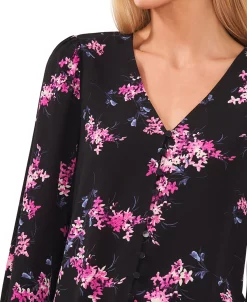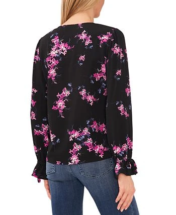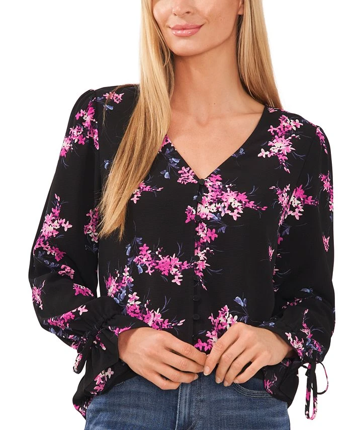 Tie details at each cuff add dainty style to this floral-print, button-down top from CeCe.
