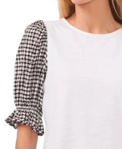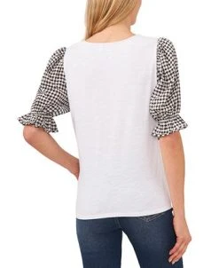 CeCe elevates the classic crewneck tee by framing it with a boldly puffed sleeve, finished in a perfect plaid, this pick delivers an oh-so chic look.