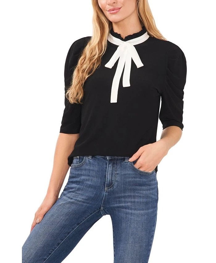 Gathered puffed sleeves lift elegantly toward the shoulder of this refined top by CeCe. Its tie neckline leaves no doubt of its super-chic style.