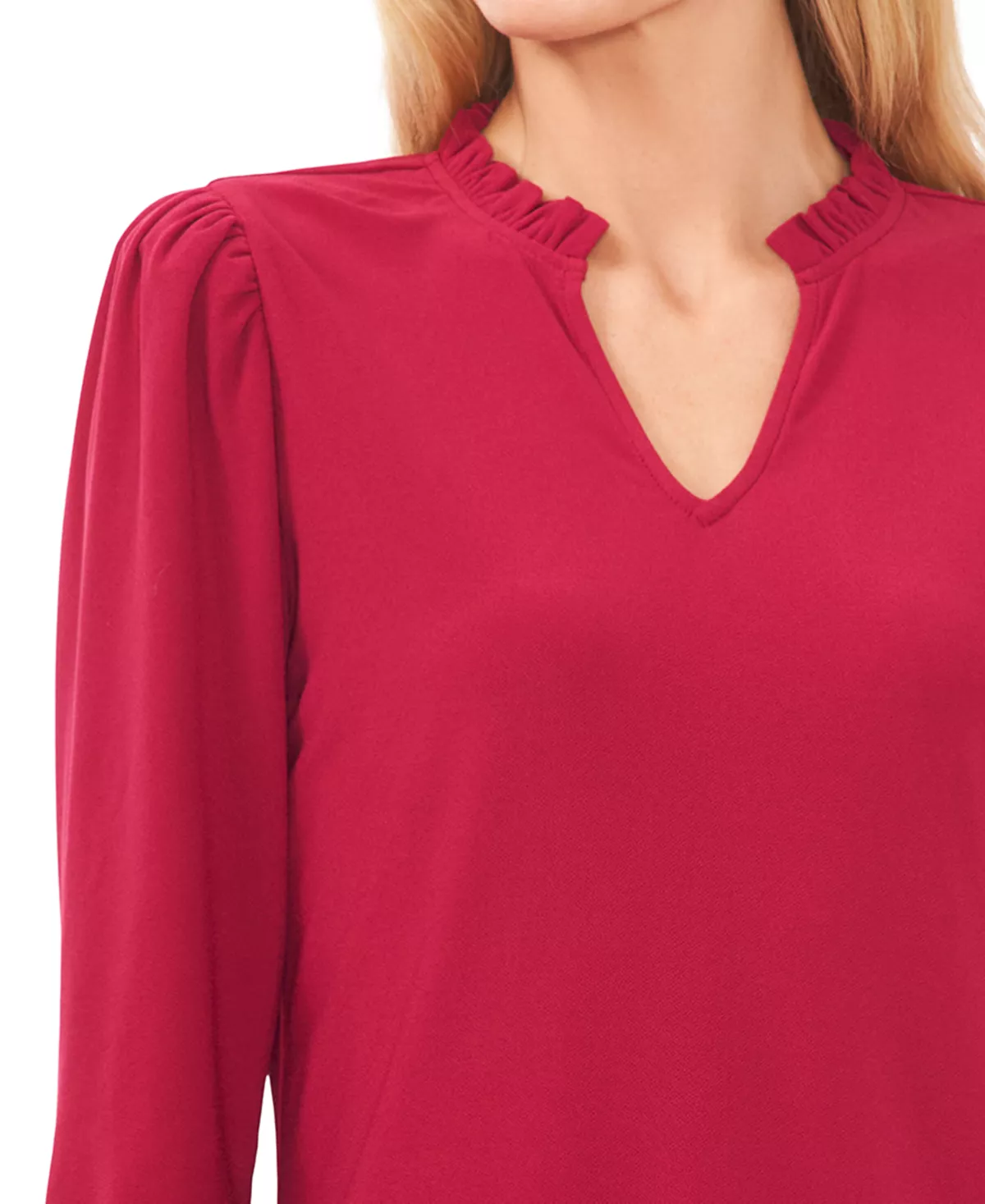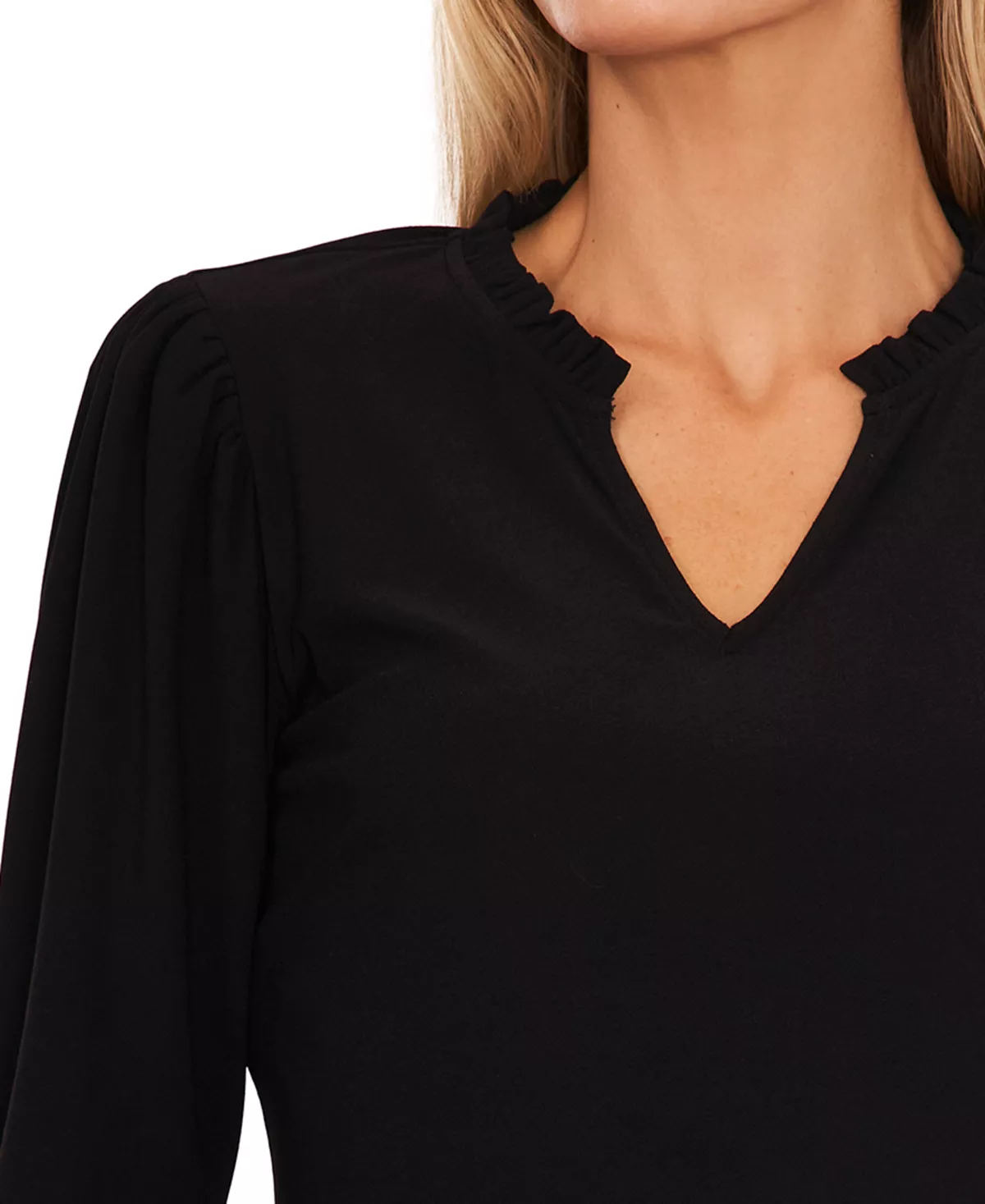 Framed with puff sleeves, CeCe’s split-neck top adds grace and style to your wardrobe.