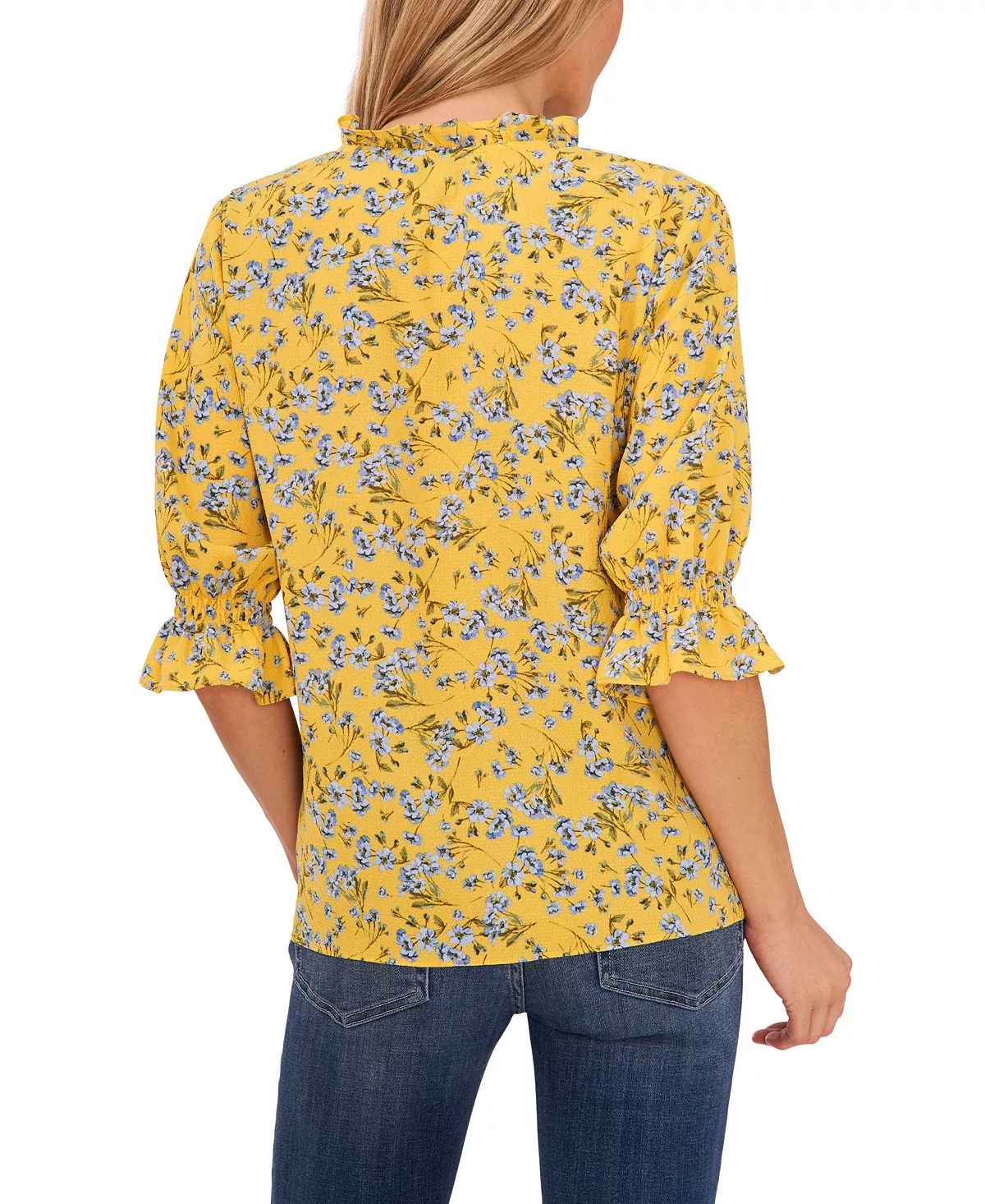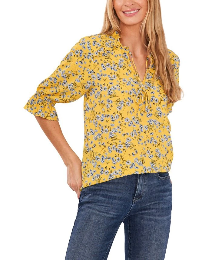 Blooming florals and ruffles aplenty lend a charmingly pretty look to this V-neck blouse by CeCe, finished with tie detailing at the neck, it’s the perfect addition to a chic casualwear collection.