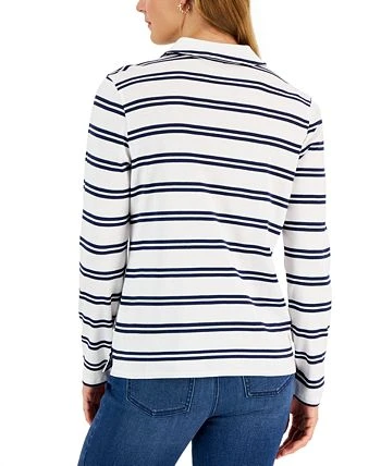 A new spin on stripes freshens this Charter Club top, in comfy all-cotton polished with a cute johnny collar.