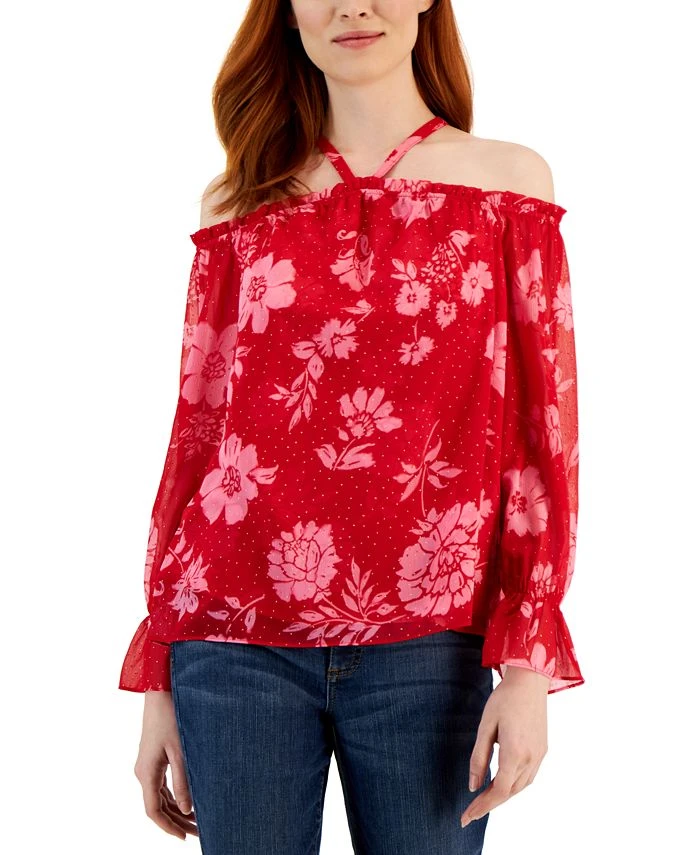 INC International Concepts elevates this ruffled cold-shoulder sleeve blouse with a halter neckline and a soft, feminine all-over print.
