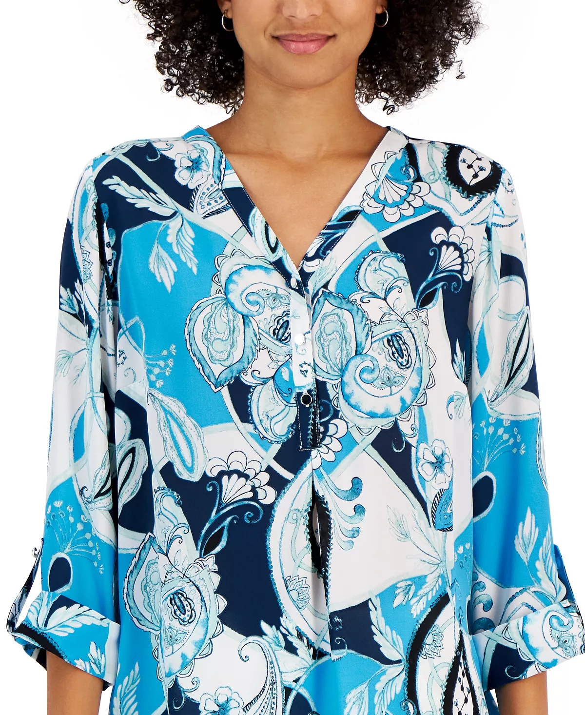 A printed tunic from JM Collection is updated with utility-inspired details roll-tab sleeves for a vibrant, contemporary look.