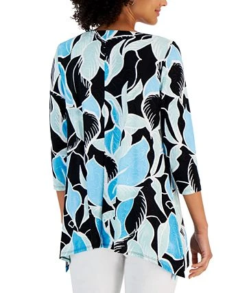 An asymmetrical hem lends a swingy feel to JM Collection’s printed, textured jacquard top. Flattering 3/4-length sleeves complete the look.