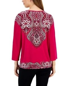 JM Collection updates your casual style with this charming 3/4-sleeve top fashioned with a tied keyhole neckline and a placed paisley print.