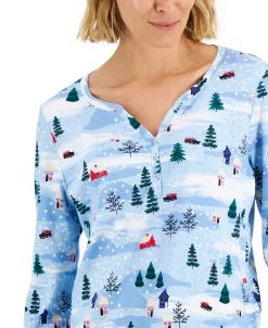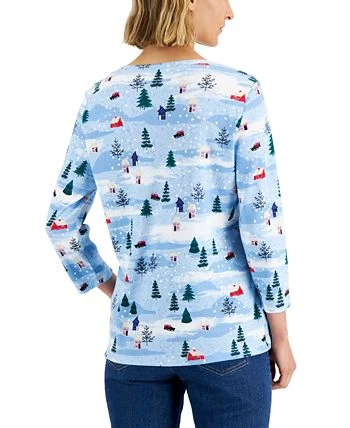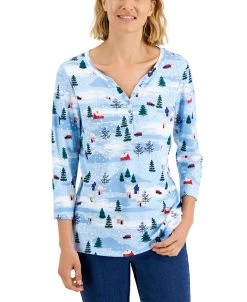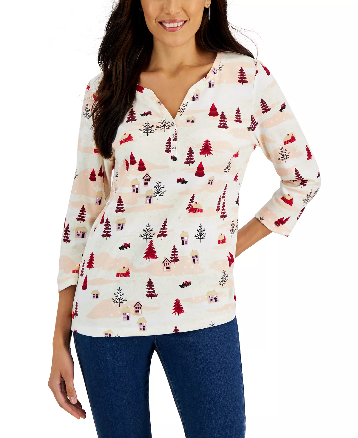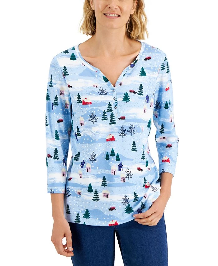Karen Scott delivers a winter wardrobe essential with this 3/4-sleeve knit top styled with a henley neckline and holiday neighborhood print.