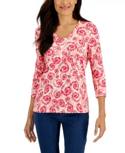 Casualwear that feels like a day at the beach! Relax and stay stylish in this 3/4-sleeve top by Karen Scott, finished in a fun, shell-print design.
