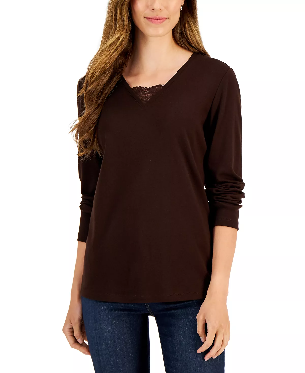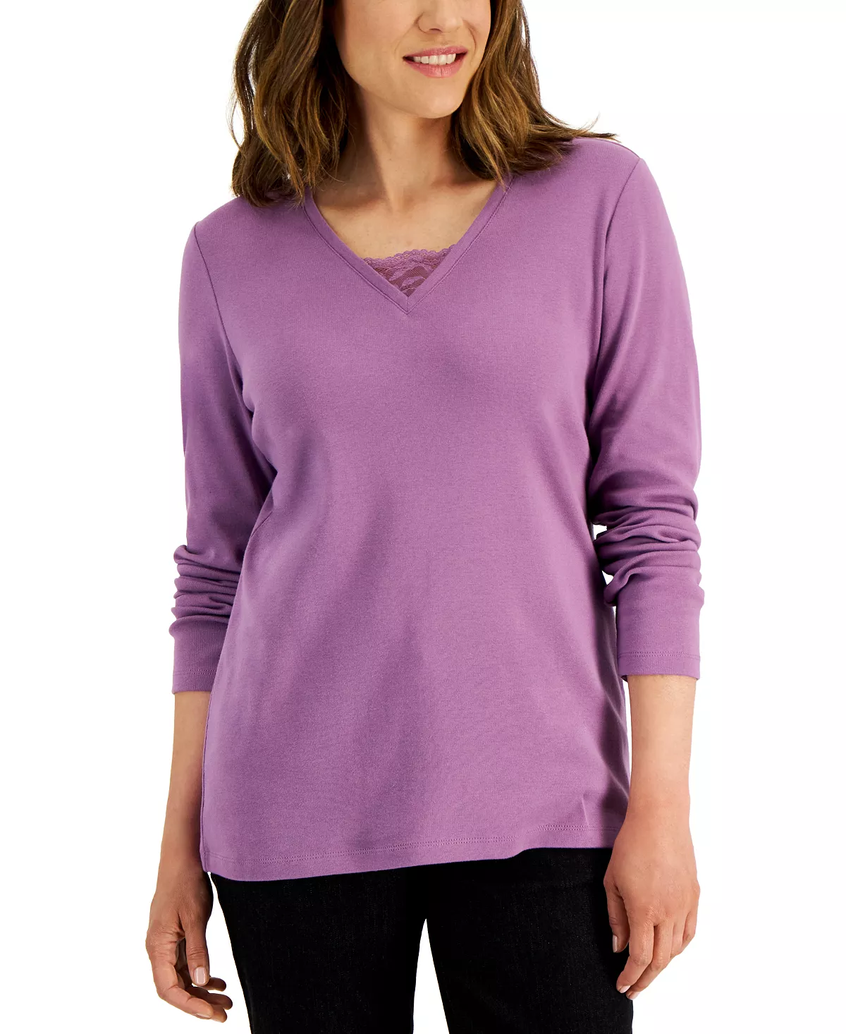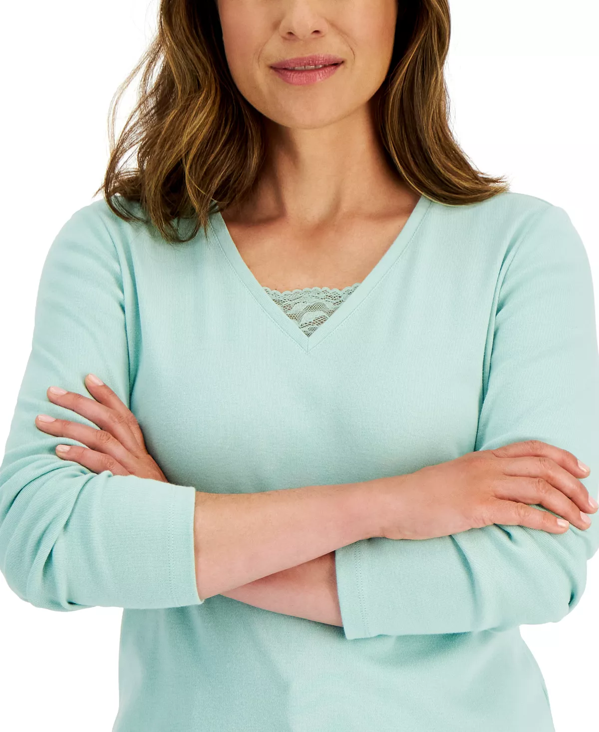 Karen Scott elevates the flattering V-neck with the charming addition of inset lace on this long sleeve top.