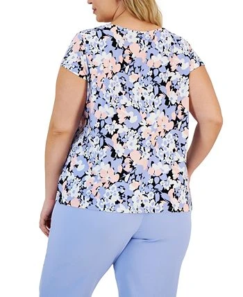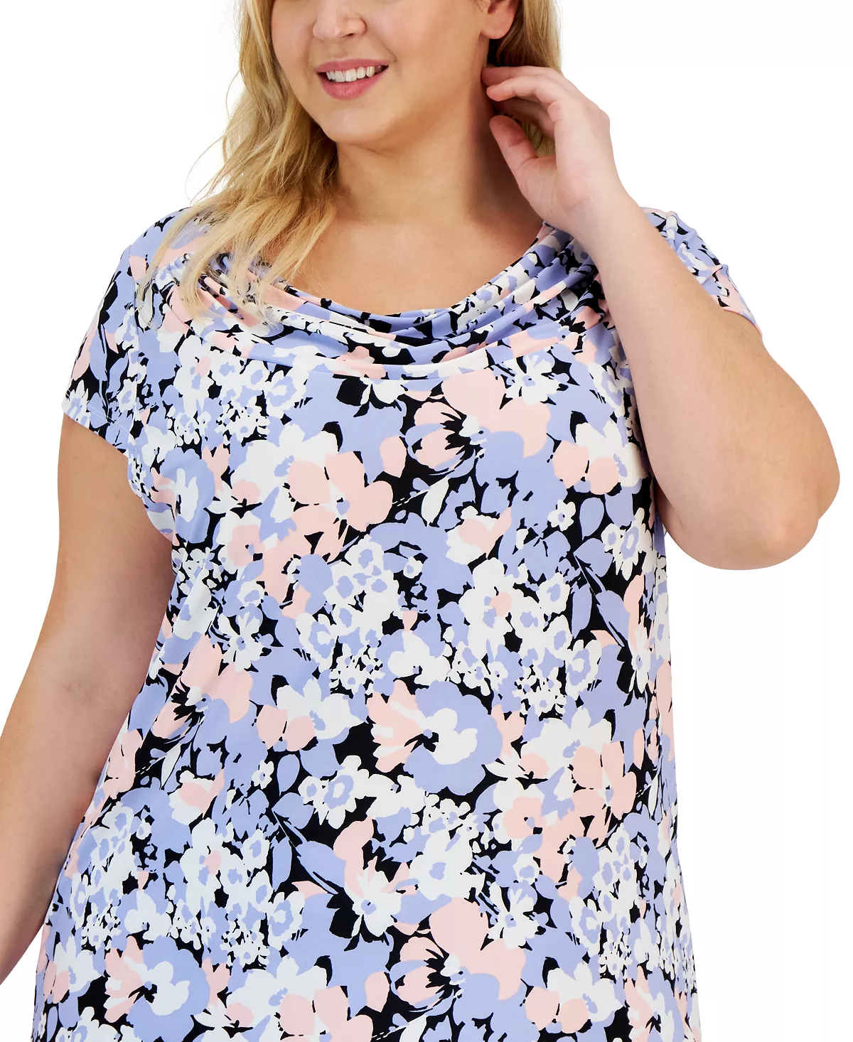 A work-approved pick from Kasper, this plus size short-sleeve top features a beautiful floral print and a cowl neck to match.