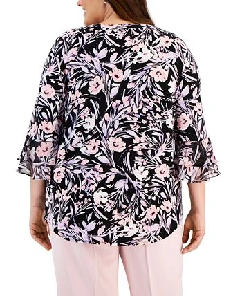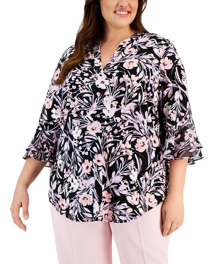 Refresh your closet with this V-neck plus size top from Kasper, featuring a fresh floral print and ruffled feminine cuffs.