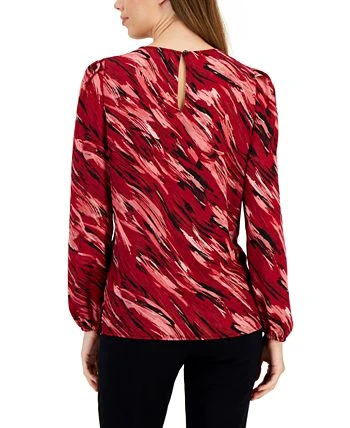 An inverted pleat at the neckline adds polish while a touch of stretch brings soft style to this abstract-print professional top from Kasper.