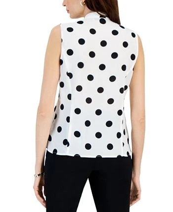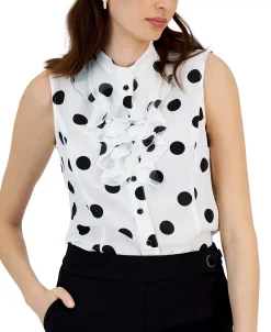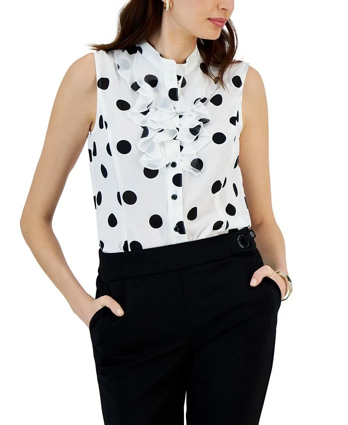 Bring a refreshing twist to your professional wardrobe with the ruffled details and polka-dot print of this Kasper sleeveless blouse.