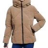 Faux-leather and faux-fur details adorn Lauren Ralph Lauren’s cozy down coat, which features ribbed cuffs and a faux fur–lined mockneck for added warmth.