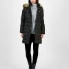 - Stand collar with zip-off drawstring hood; front zipper closure with button overlay