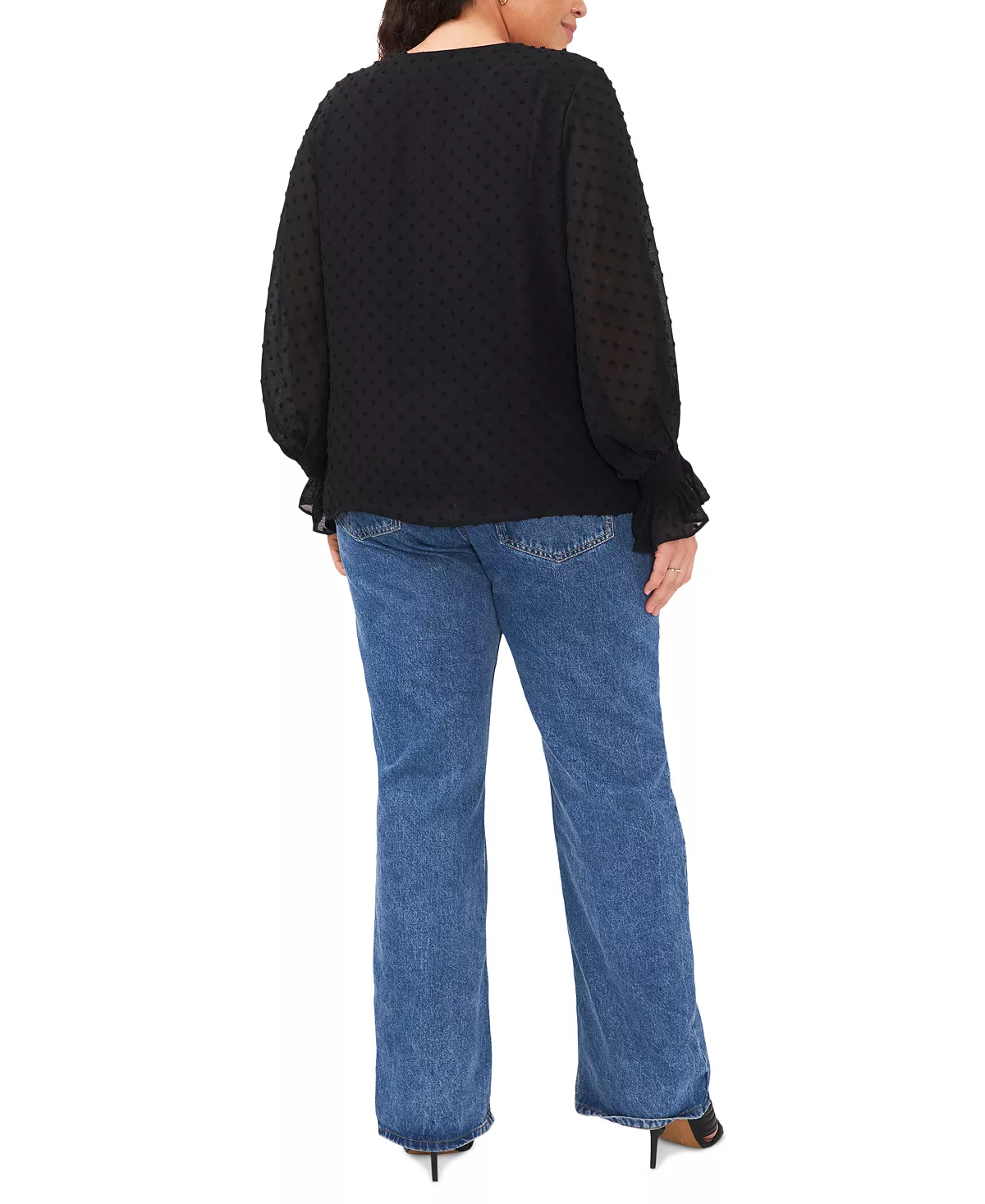 Subtle clip-dot fabric lends texture to Vince Camuto’s plus size blouse. Smocked cuffs complete the look.