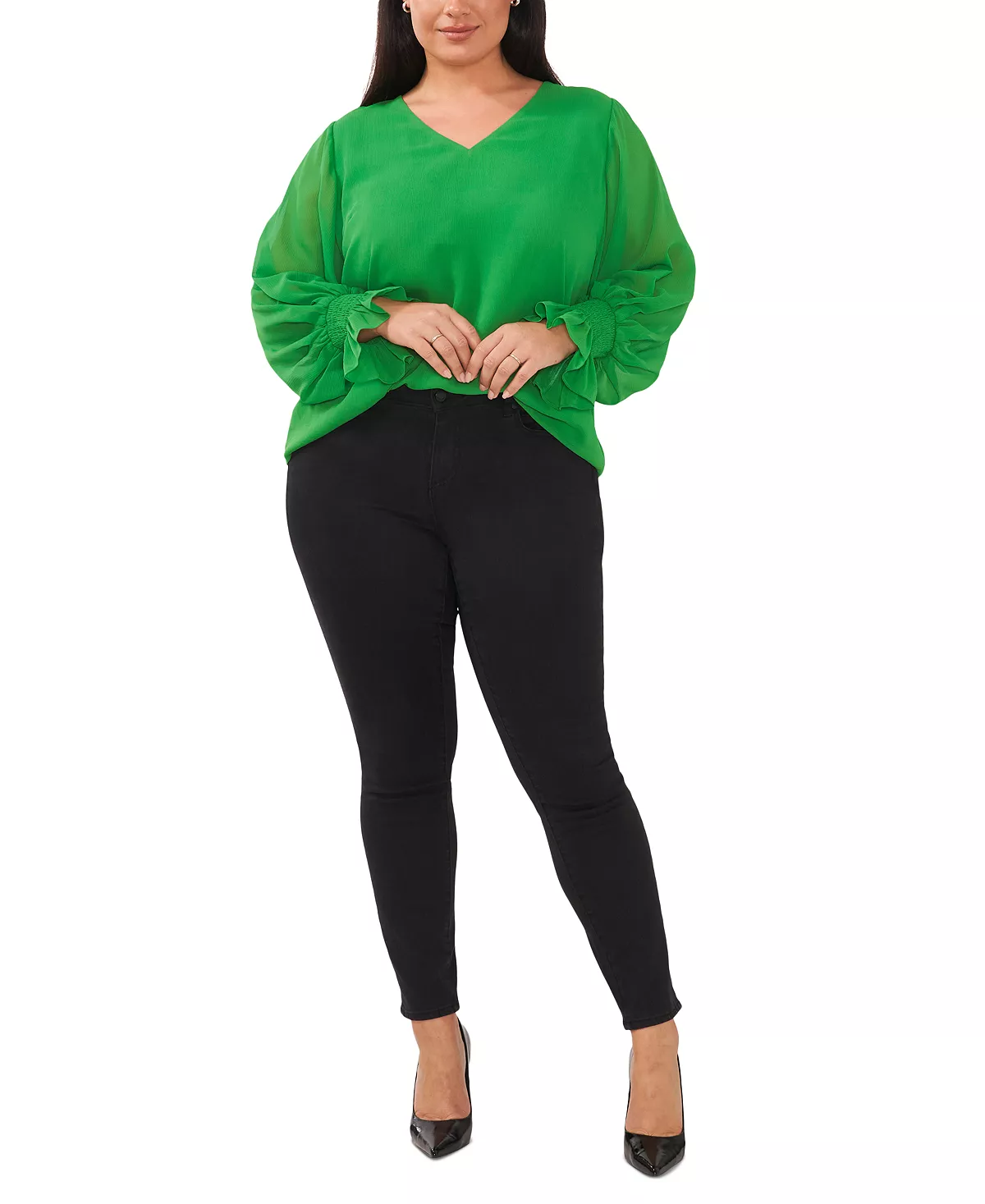 You can dress up your look and keep it playful with this plus size top from Vince Camuto, finished with ruffled cuffs.
