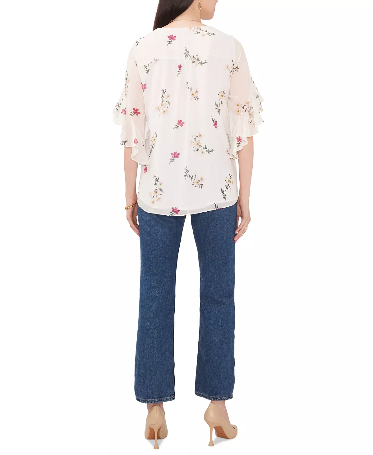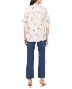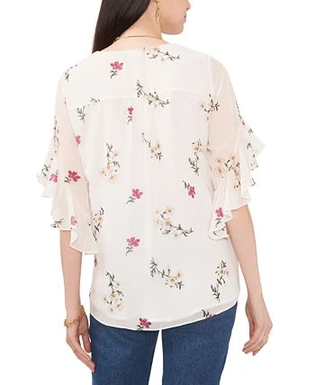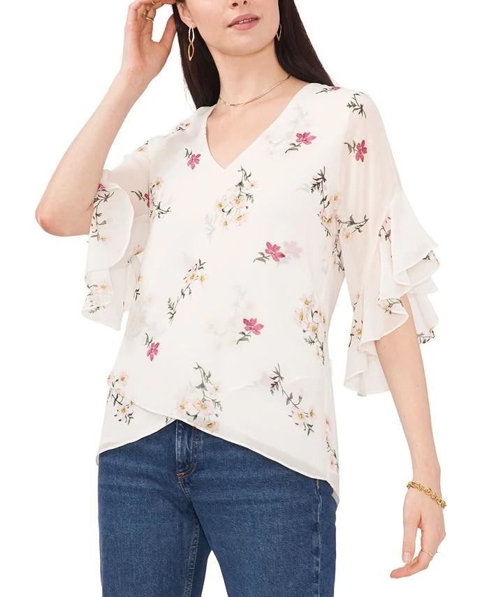 Cascading ruffles at the sleeves are a sweet finish for this charming Vince Camuto top, in a vintage-inspired floral print with an overlap at the hem.